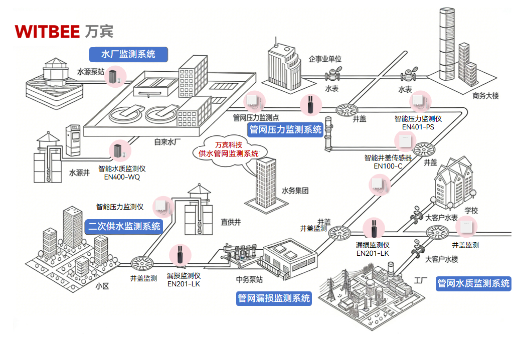 WITBEE®万宾科技®供水管网监测系统通过智能压力计、漏损仪、超声波流量计等设备,实现水源到用户的全链路数智化监管,提升供水稳定性与运维效率。