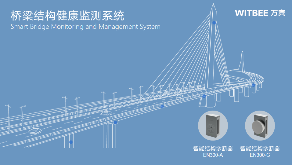 WITBEE®万宾科技®桥梁健康监测系统是一种先进的综合性监测技术,它通过对桥梁的结构性能、环境因素等进行实时监测,利用智能结构诊断器、智能视觉形变仪、河湖水位监测仪、河湖流速监测仪等获取桥梁的健康状况,为桥梁的维护和管理提供科学依据。