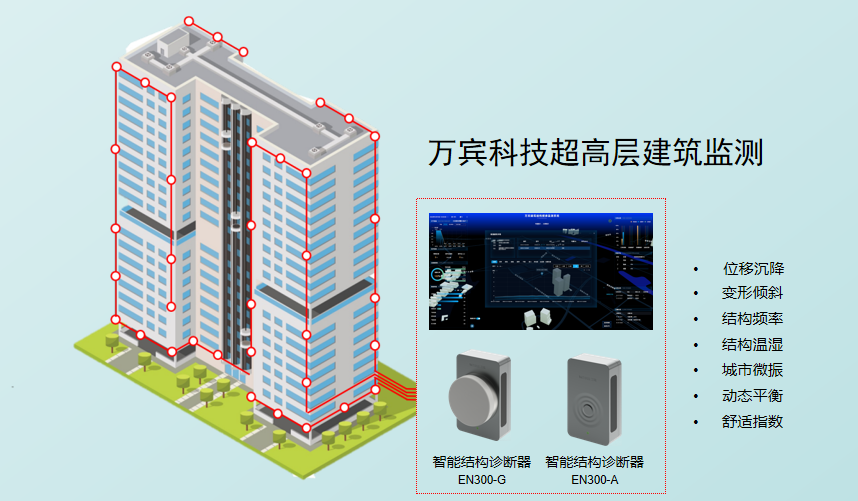 WITBEE®万宾®致力于建筑结构健康监测领域,为超高层建筑提供全方位的监测解决方案。通过智能结构诊断器、环境传感器和视频监控等设备,实时收集建筑的位移、沉降、倾斜、加速度、振幅、频率、结构温度和动态平衡等关键数据,以及风力、温度等外界条件,对建筑结构安全进行快速评估。