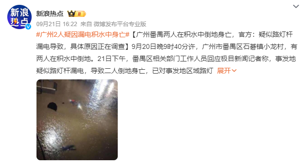 9月20日晚9时40分许,广州市番禺区石碁镇小龙村,有两人在积水中倒地。21日下午,事发地疑似路灯杆漏电,导致二人倒地身亡,已对事发地区域路灯采取临时断电处理,事件具体原因正在调查。