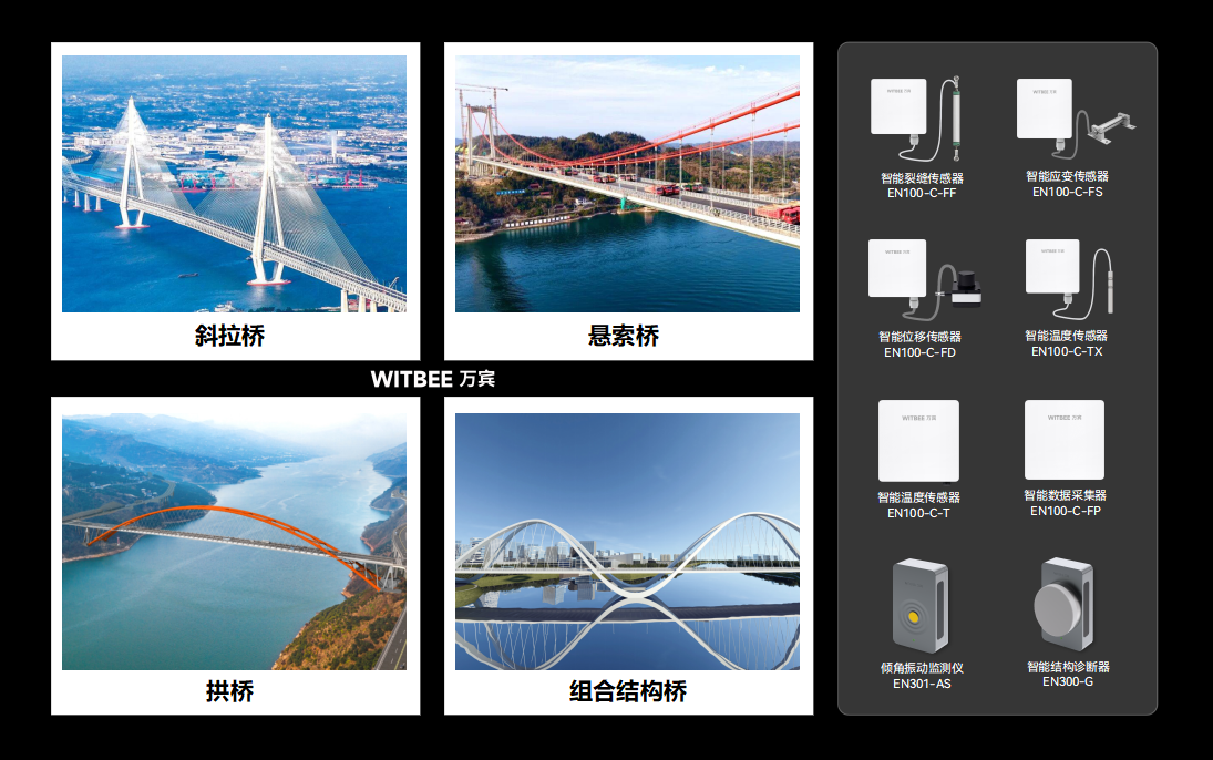 斜拉桥、悬索桥、系杆拱桥、组合结构桥,还有各种造型特别的异形桥,桥梁种类越来越多。这些桥梁结构不一样,受力方式也大不相同,监测过程中的要求自然也不一样。比如大跨度桥梁,要特别注意索力的变化;拱桥则要注意拱肋的应力分布;立交桥则重点需要监测车辆荷载等。WITBEE®万宾科技®桥梁结构健康监测系统能根据不同桥型布置传感设备,助力数据采集分析。