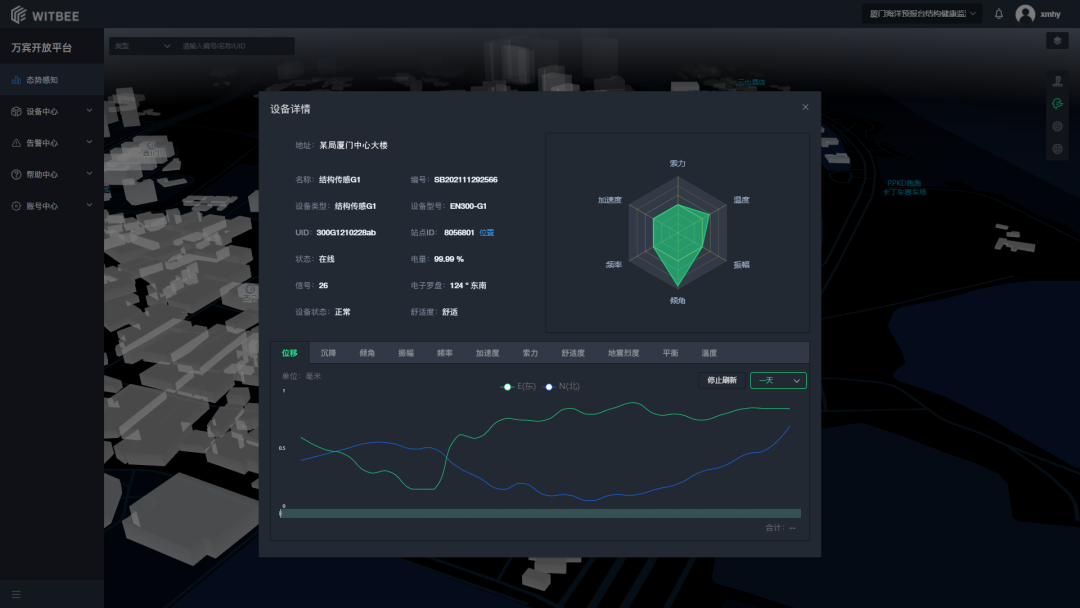 实时监测位移、沉降、倾斜、加速度、振幅、频率、地震烈度、动态平衡、人体舒适度和结构温湿度等指标。