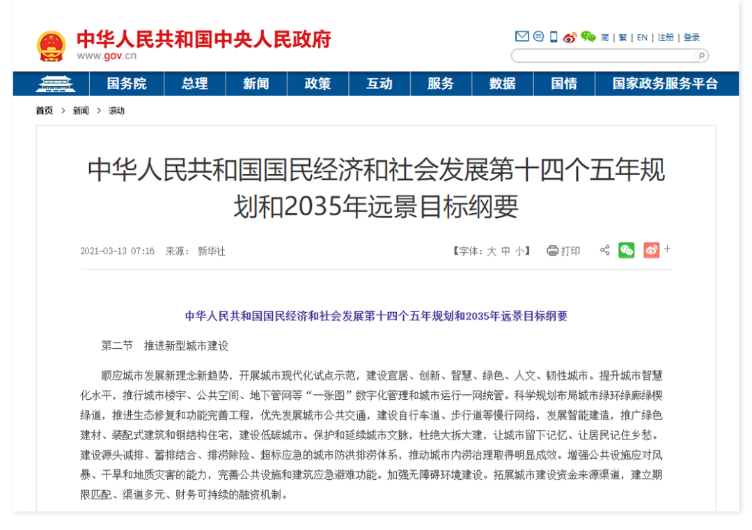 2021年3月《中华人民共和国国民经济和社会发展第十四个五年规划和2035年远景目标纲要》,提升城市智慧化水平,推行城市楼宇、公共空间、地下管网等“一张图”数字化管理和城市运行一网统管。