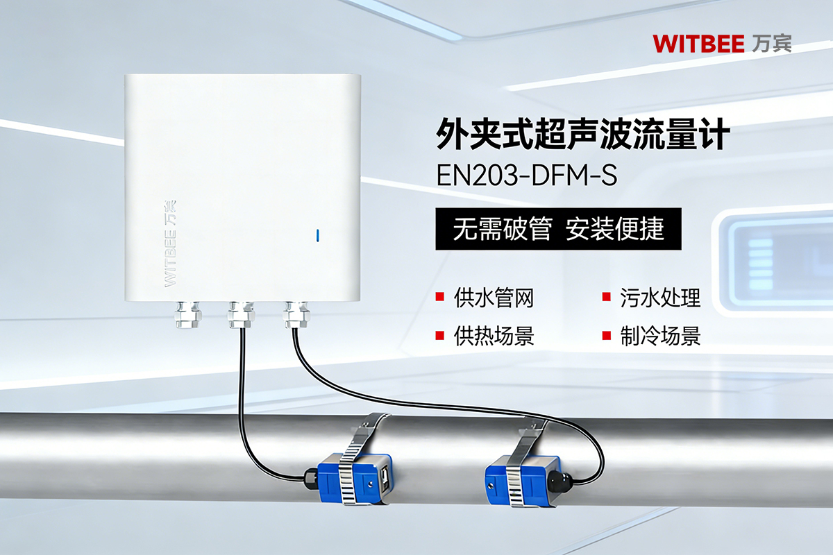 WITBEE®万宾科技®外夹式超声波流量计EN203-DFM-S采用非接触测量与智能算法,有效降低管道气泡对流量测量精度的影响,提升供水系统运行效率。